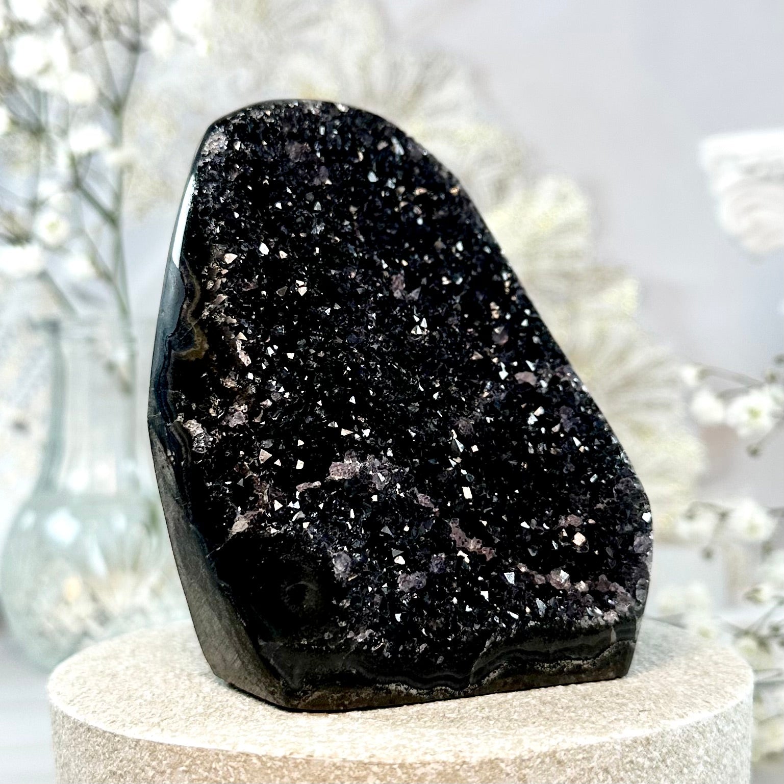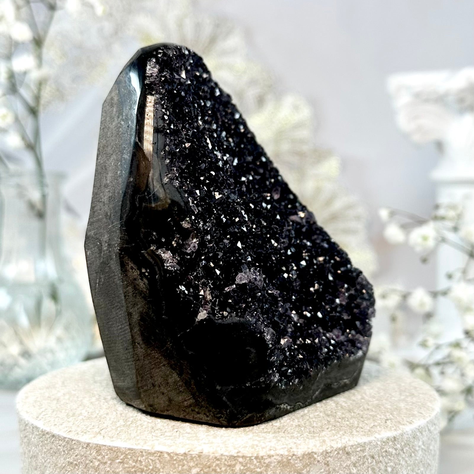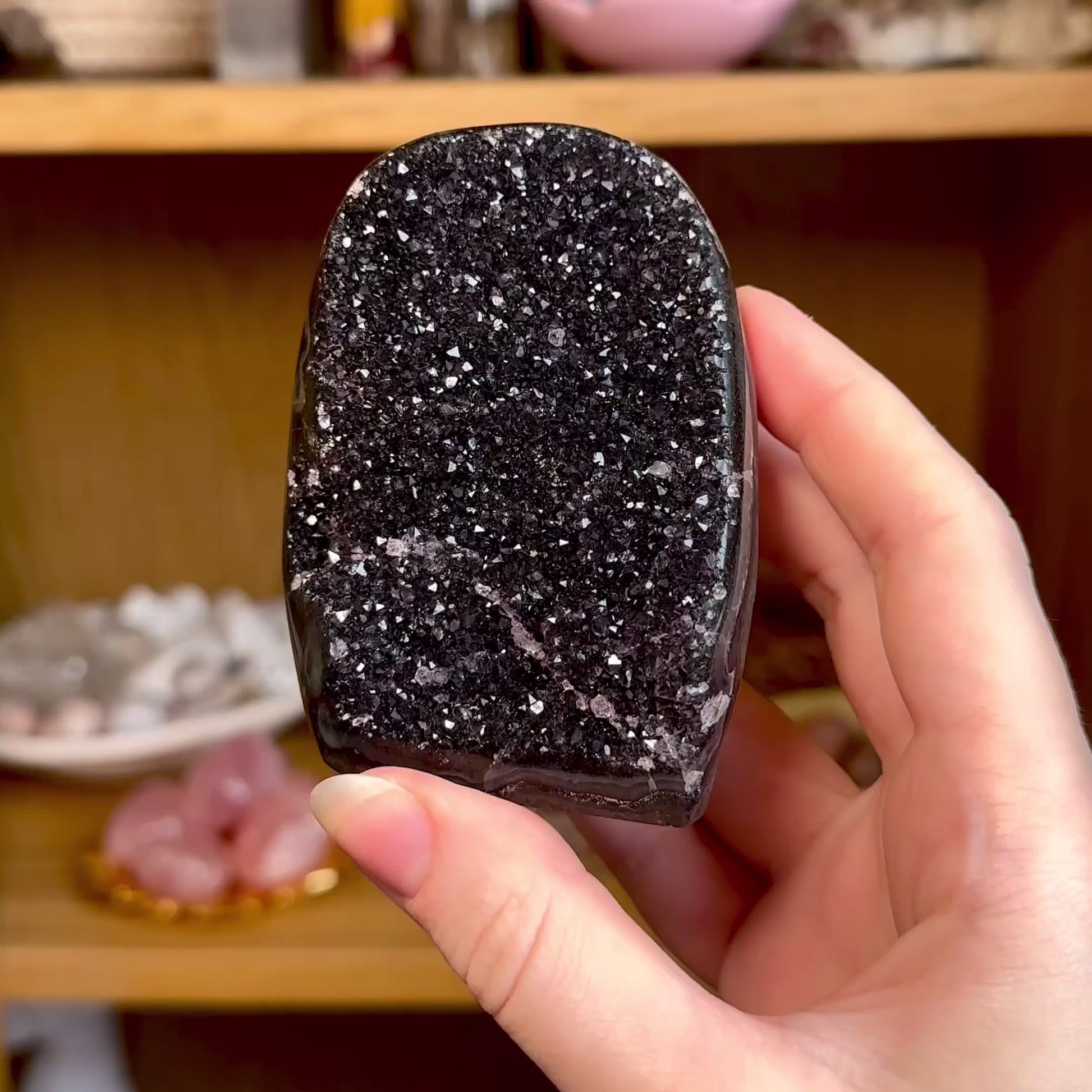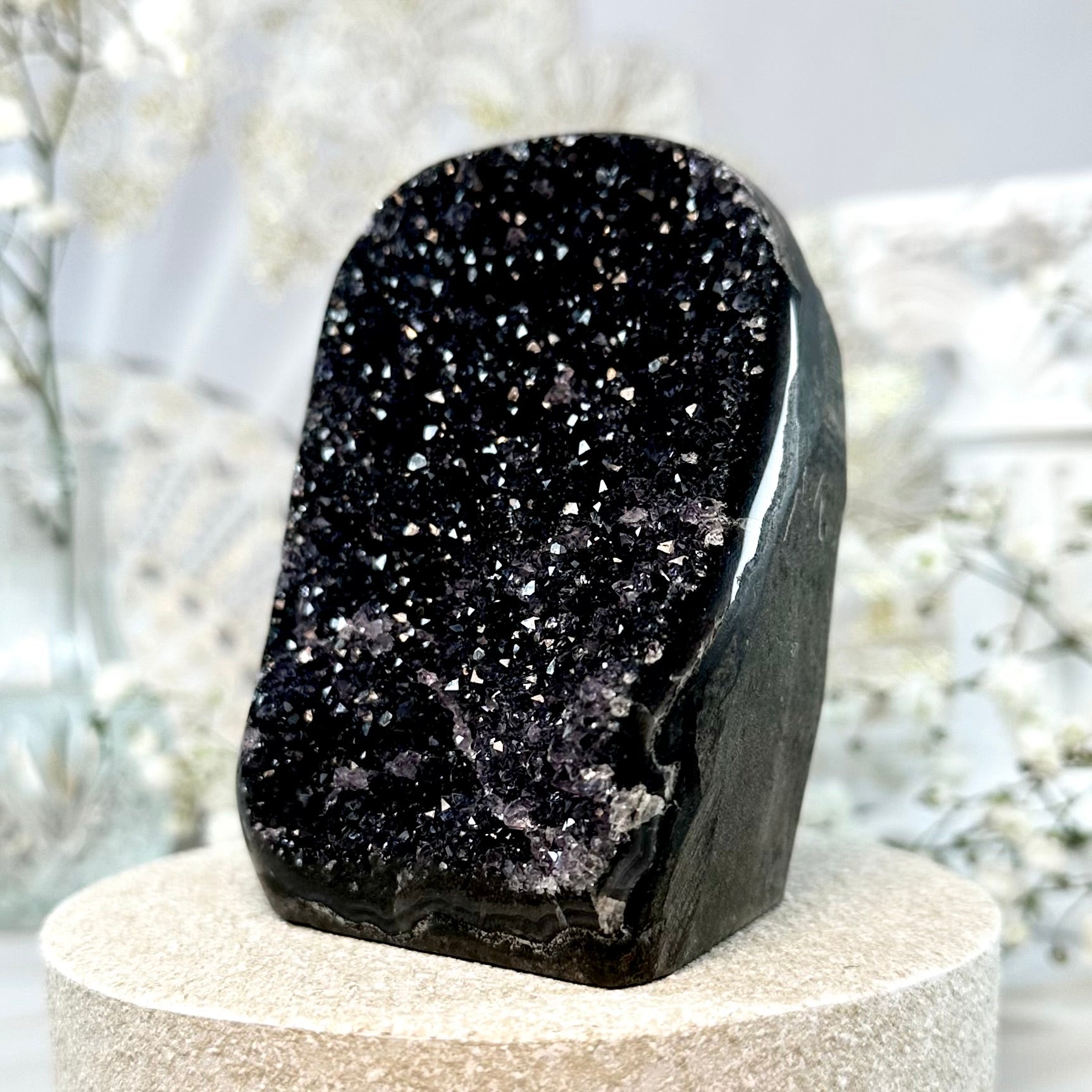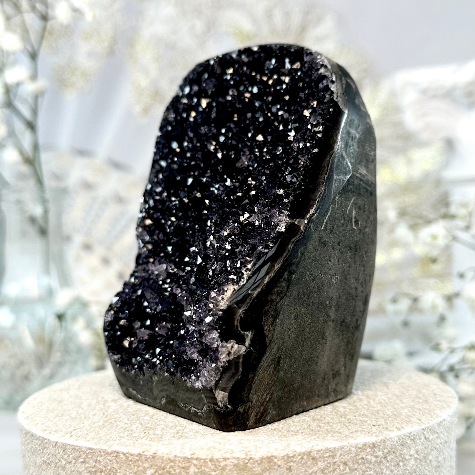 This listing is for one black amethyst geode, as pictured. Measurements can be found as follows: 83mm height, 375g weight.