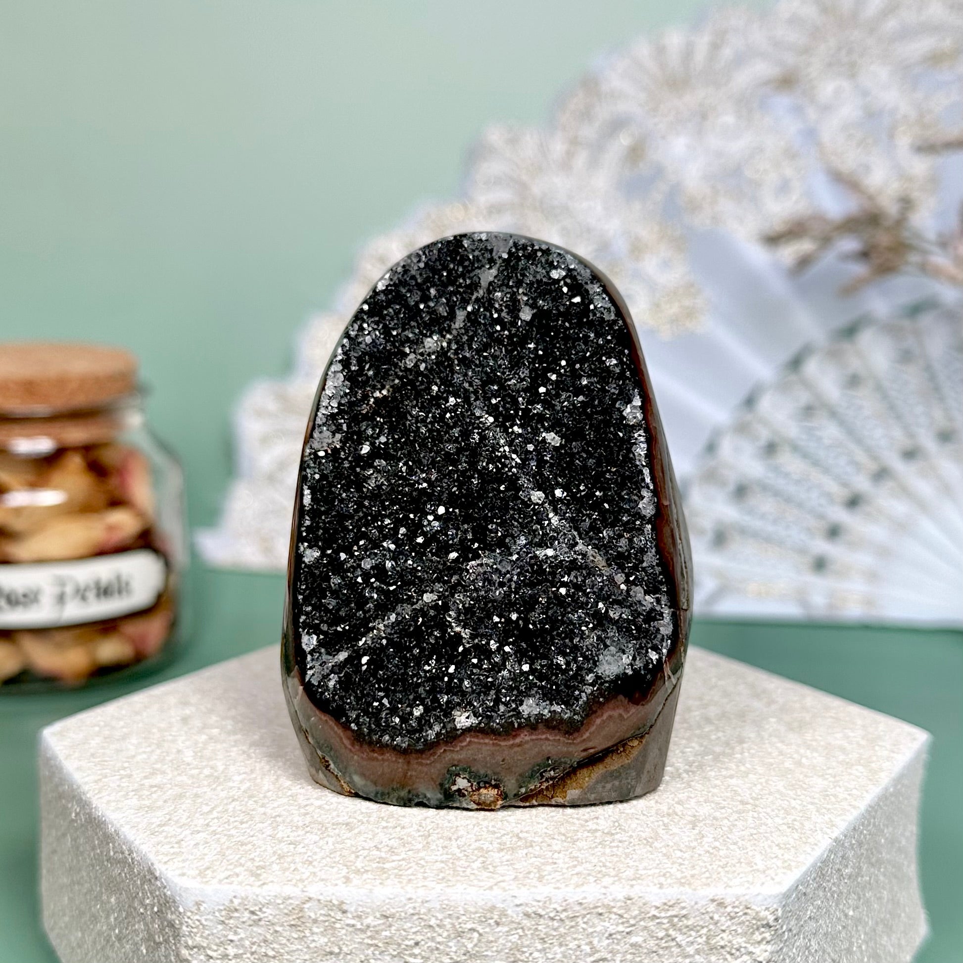 Amethyst is a high-vibrational stone, and is deeply connected with the spiritual realm. It is known for heightening intuition and psychic abilities, and is often used to aide meditation. Amethyst is steeped in ancient magic and has an affiliation with dreams; it is used to ward off night-terrors and insomnia, and also to enhance prophetic dreams and connection with spirit guides through the dreamscape. The "black" colour forms due to high amounts of hematite and iron, however the piece is still amethyst as it is a very dark shade of purple.