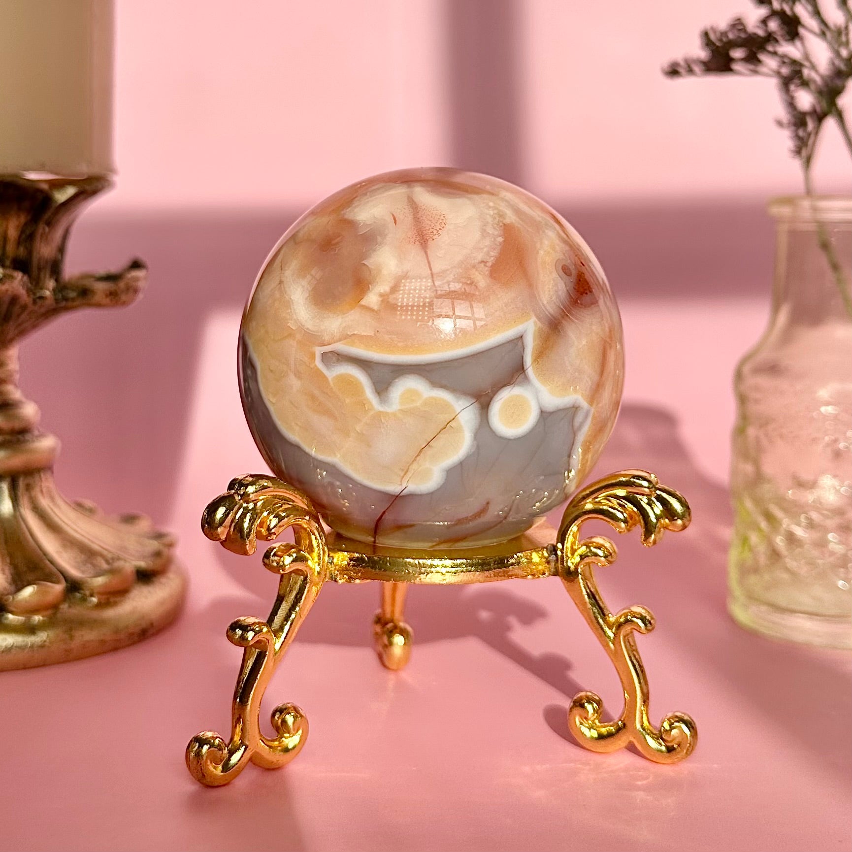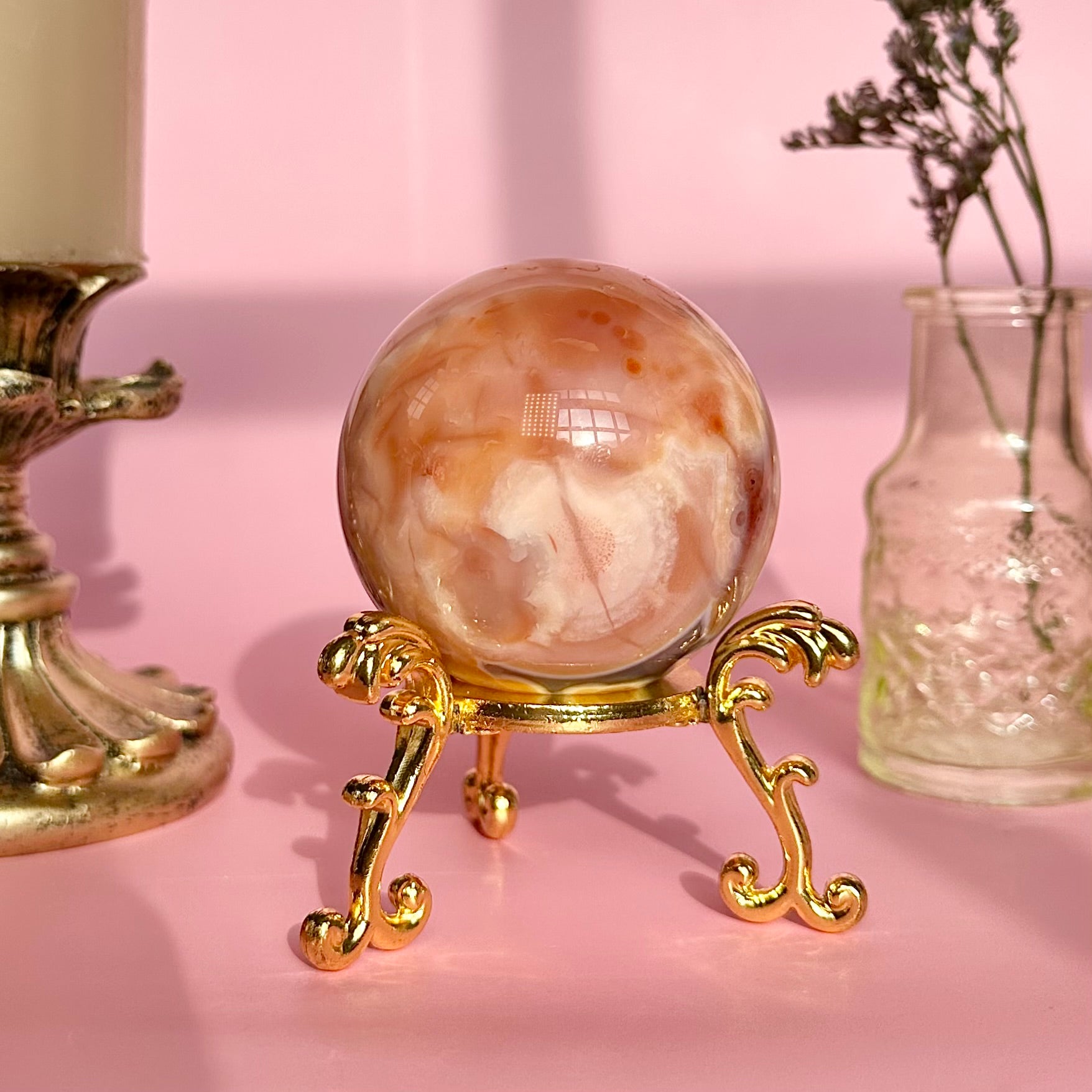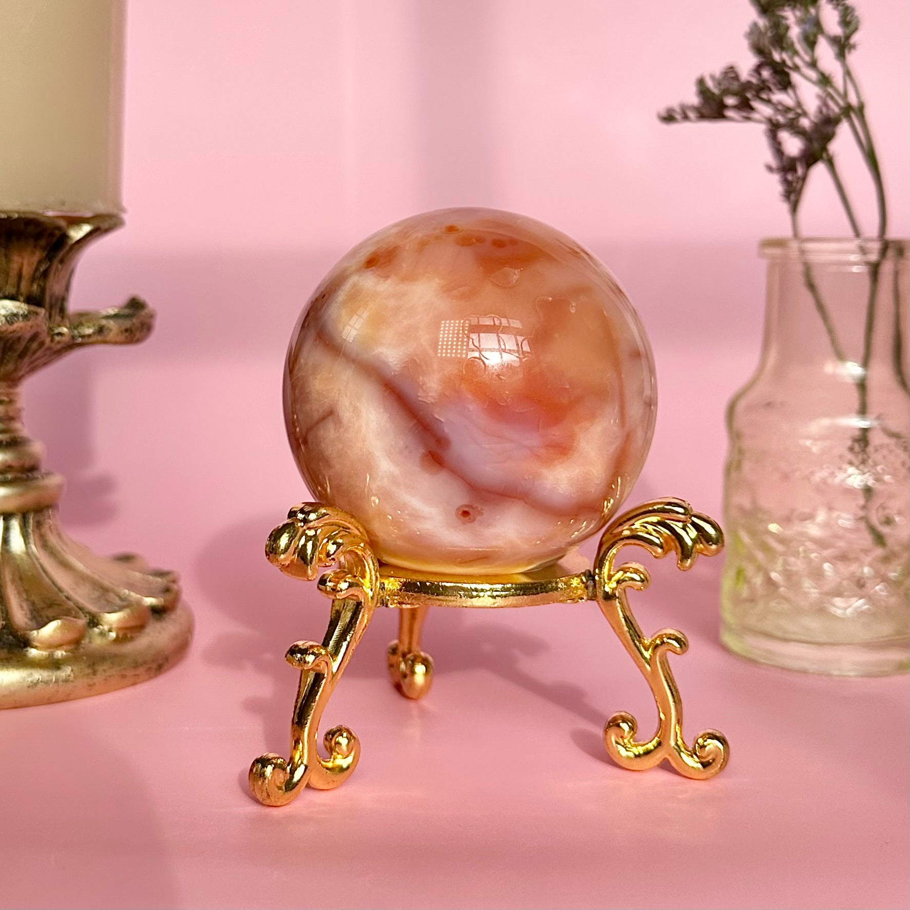 Carnelian is a stone with creative, courageous energy. It encourages you to be your most unique and authentic self, exuding a bold and innovative aura and alleviating anxiety. Flower Agate has a gentle, calming energy. It often inspires personal-growth and aides with manifestation. This sphere is the perfect powerhouse for grounding and balancing, while passionately energizing.