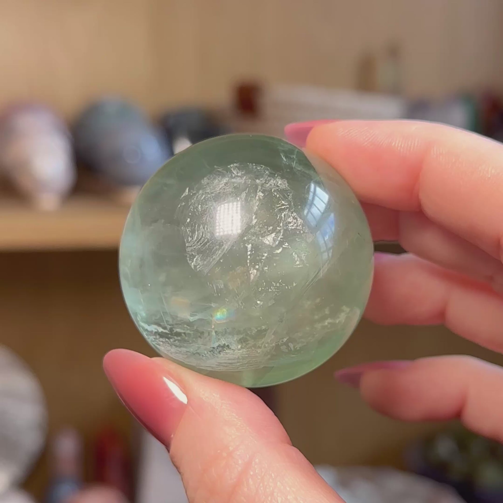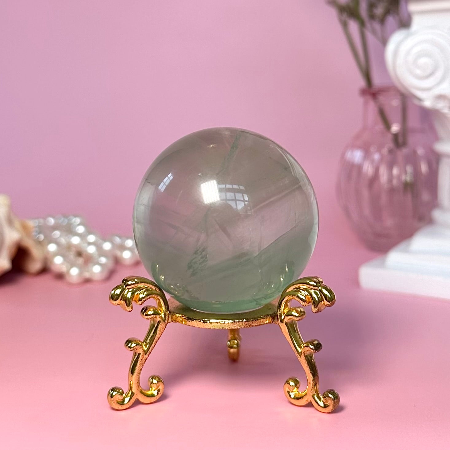 This listing is for one green fluorite sphere as pictured, which measures 45mm and weighs 155g. A wooden ring stand (not pictured) will be included upon purchase.