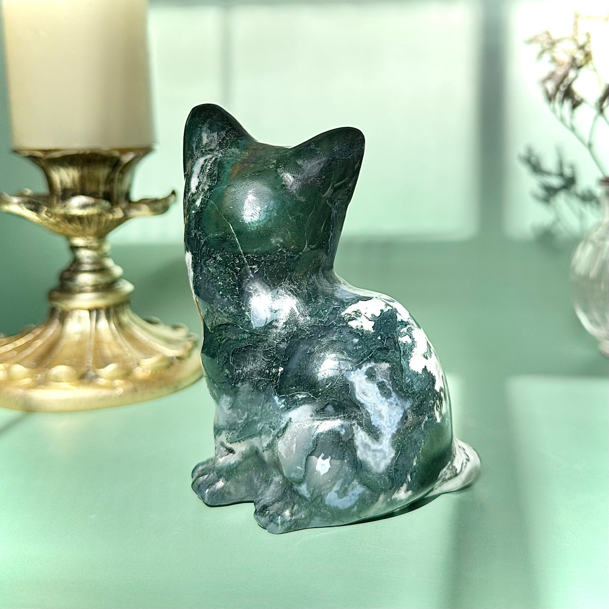 This listing is for one moss agate cat, as pictured. This piece measures 94mm in height and weighs 367g.