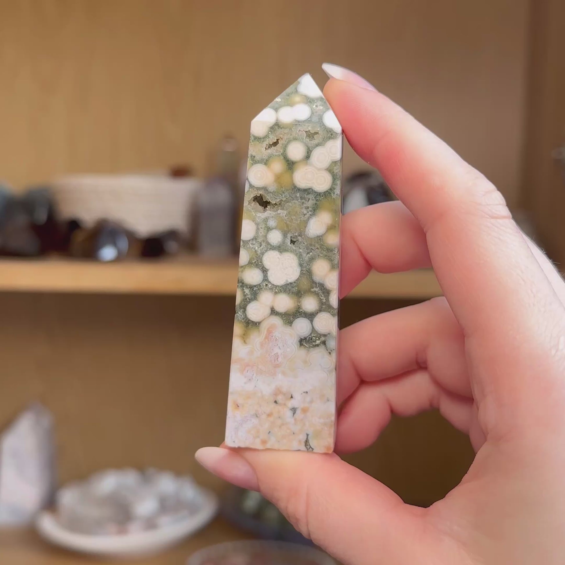 Ocean Jasper is a joyful stone, encouraging you to "go with the flow" just like the tides of the sea. It is known for helping with clear communication and aides meditation. This gorgeous tower displays orbs and druzy detailing throughout.