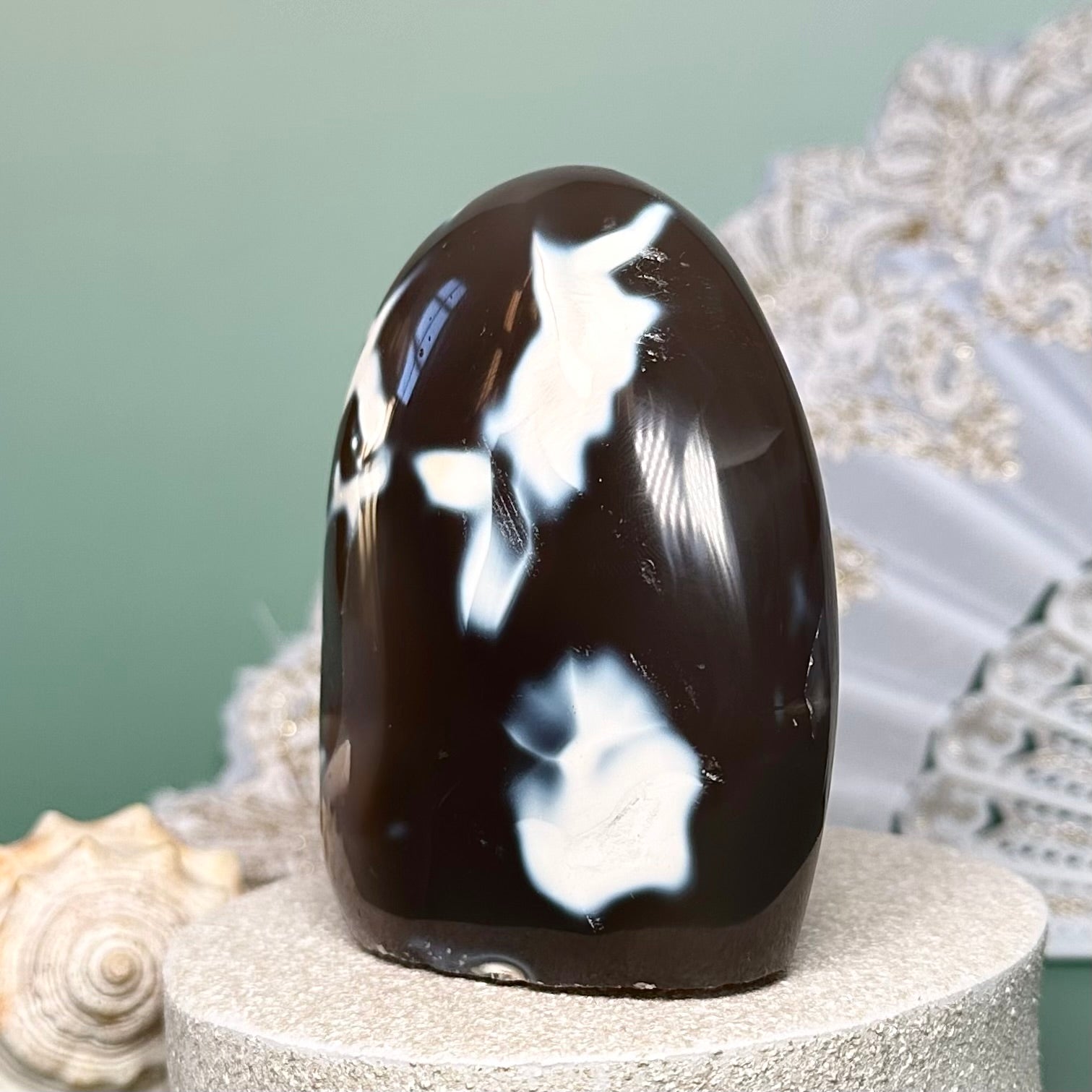 This listing is for one Orca Agate Free Form as pictured. This piece measures 84mm in height and weighs 295g.