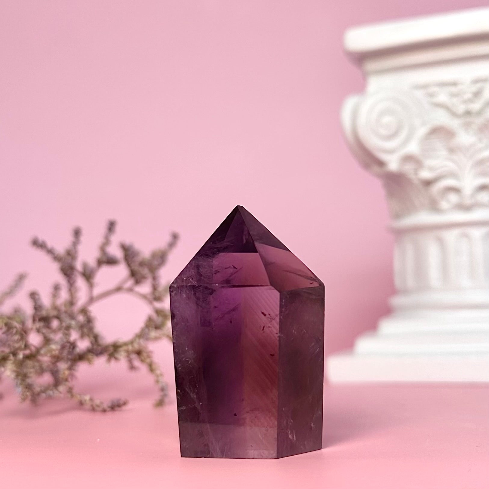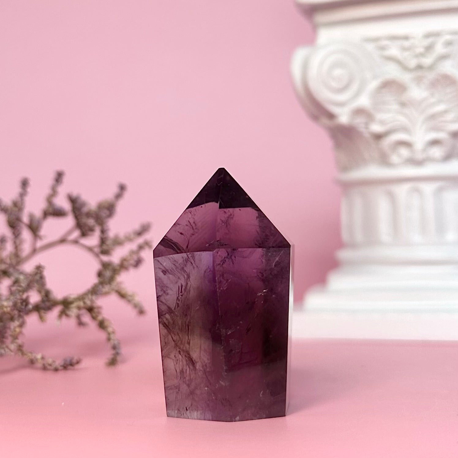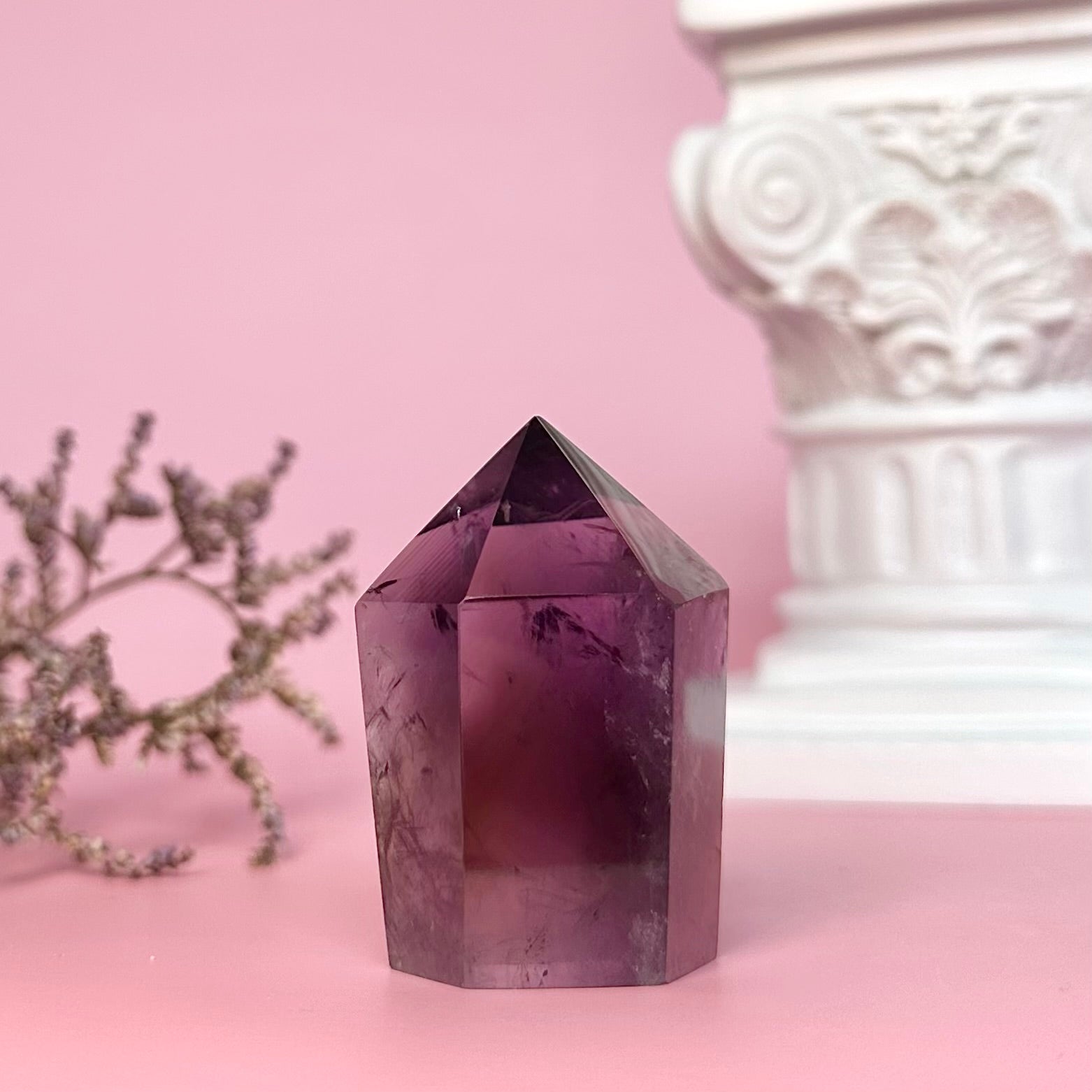 Amethyst is a high-vibrational stone and is deeply connected with the spiritual realm. It is known for heightening intuition and psychic abilities, and is often used to aide meditation. Amethyst is steeped in ancient magic and has an affiliation with dreams; it is used to ward off night-terrors and insomnia, and also to enhance prophetic dreams and connection with spirit guides through the dreamscape. This amethyst mini tower displays beautiful phantoms from certain angles.