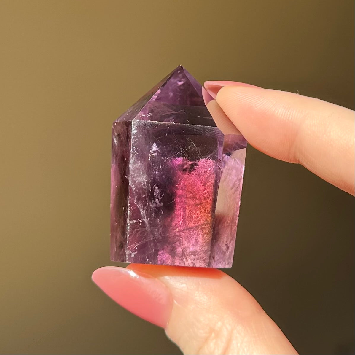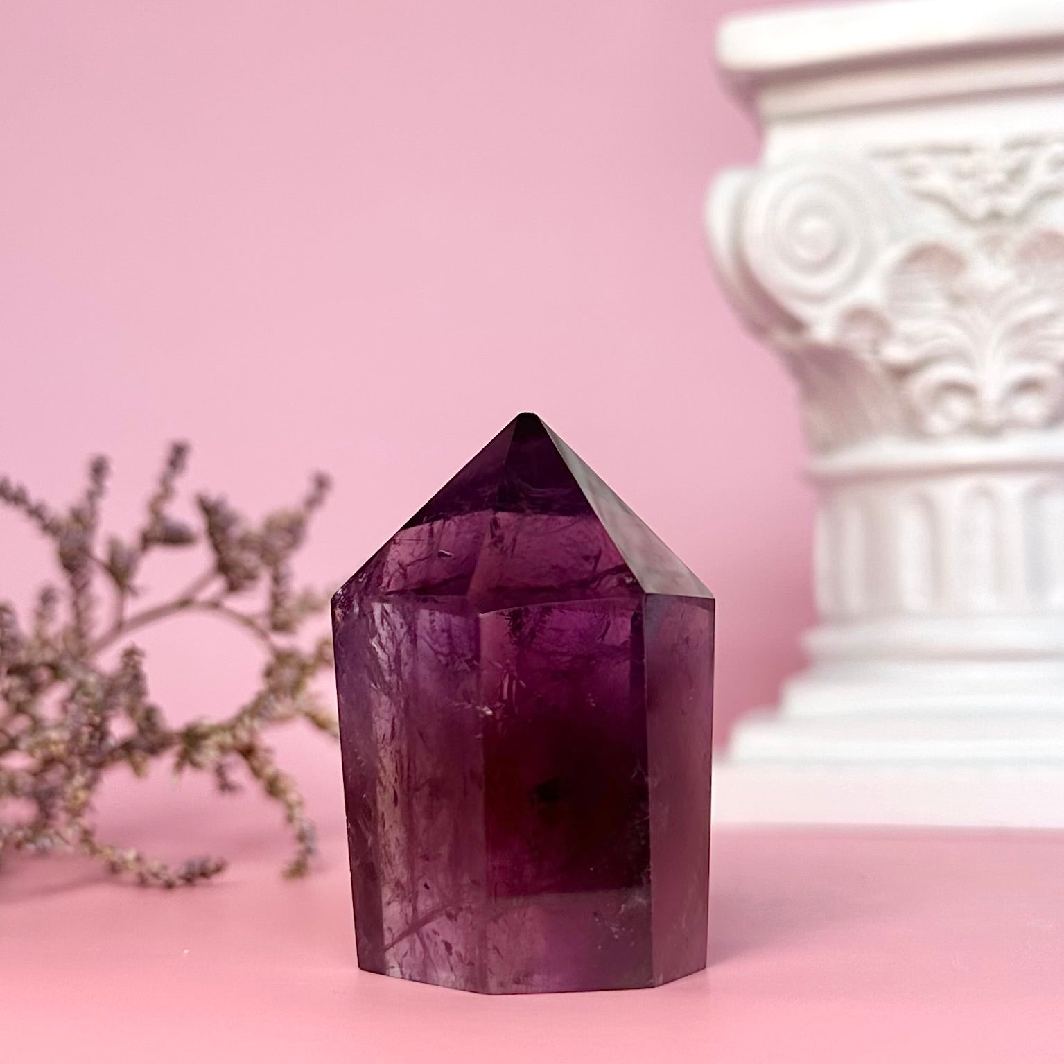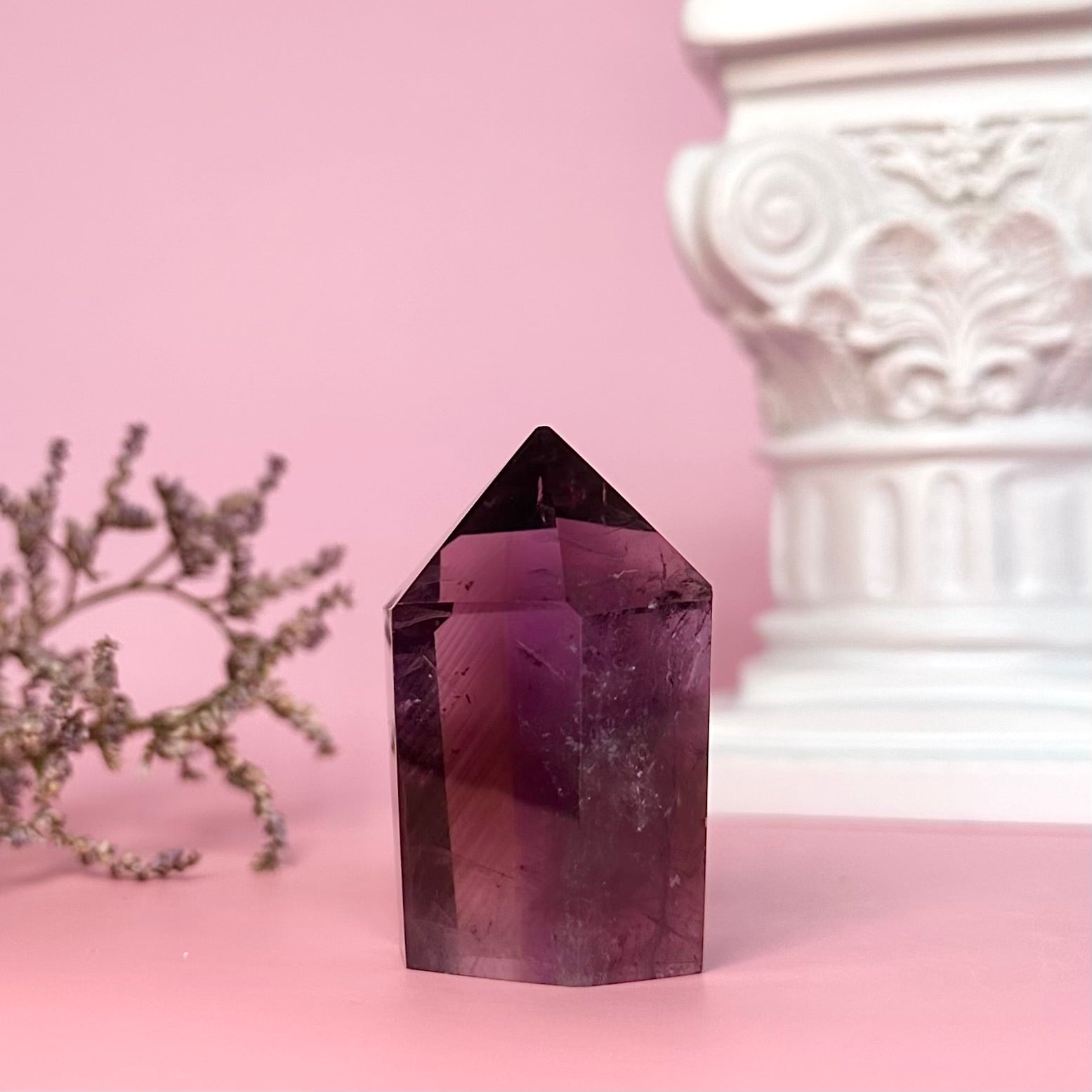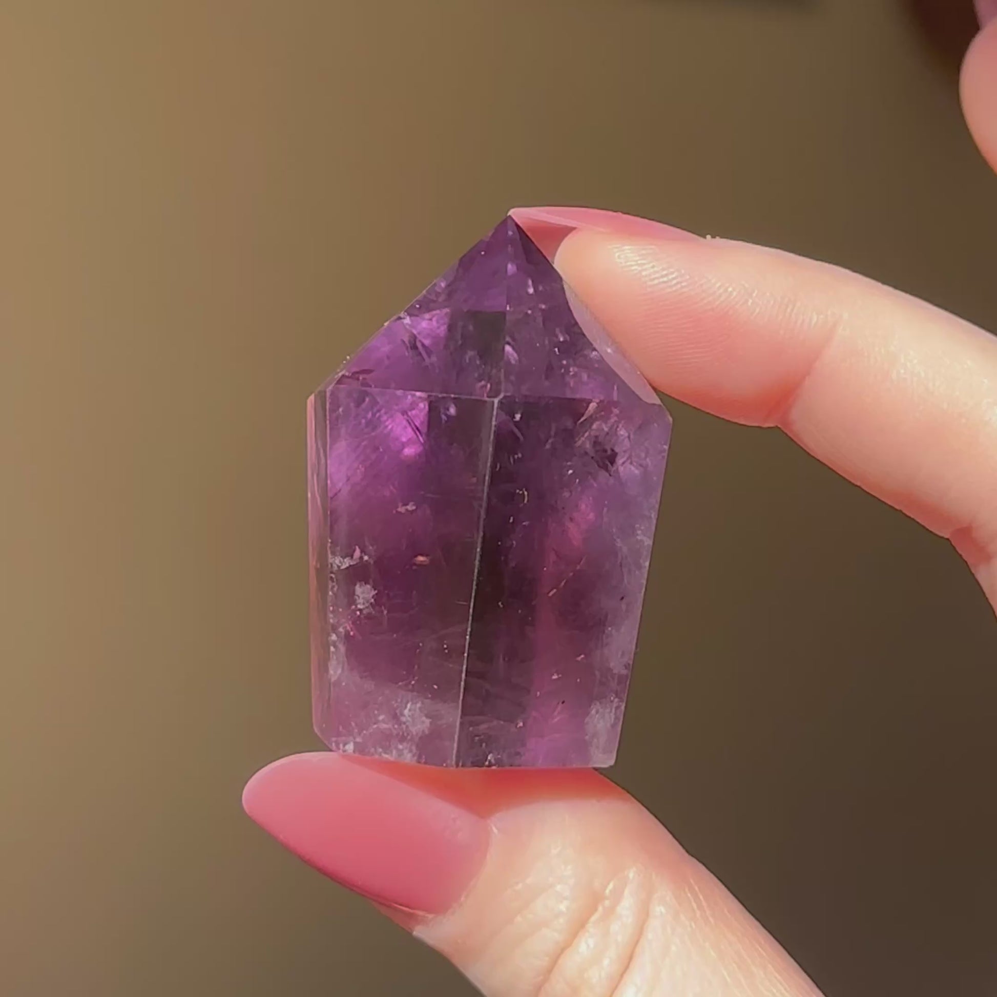 Amethyst is a high-vibrational stone and is deeply connected with the spiritual realm. It is known for heightening intuition and psychic abilities, and is often used to aide meditation. Amethyst is steeped in ancient magic and has an affiliation with dreams; it is used to ward off night-terrors and insomnia, and also to enhance prophetic dreams and connection with spirit guides through the dreamscape. This amethyst mini tower displays beautiful phantoms from certain angles.