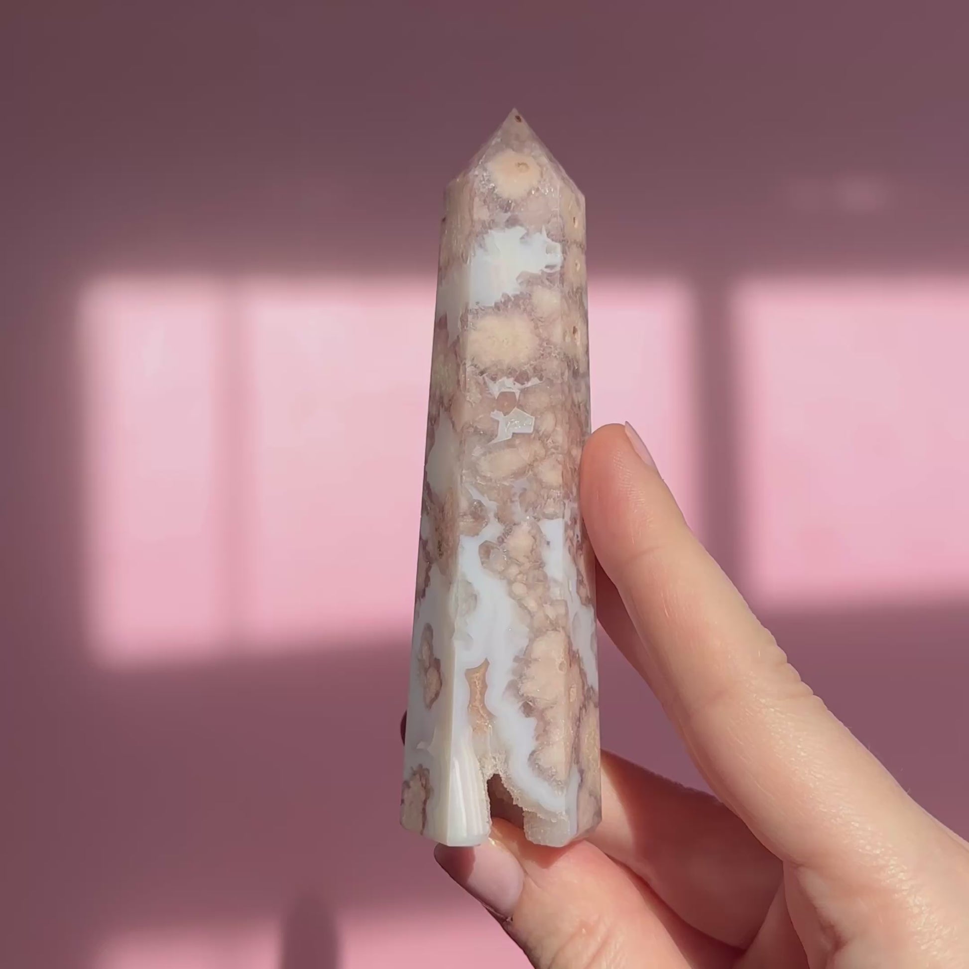 This listing is for one flower agate tower, as pictured. This piece measures 115mm in height and weighs 125g.