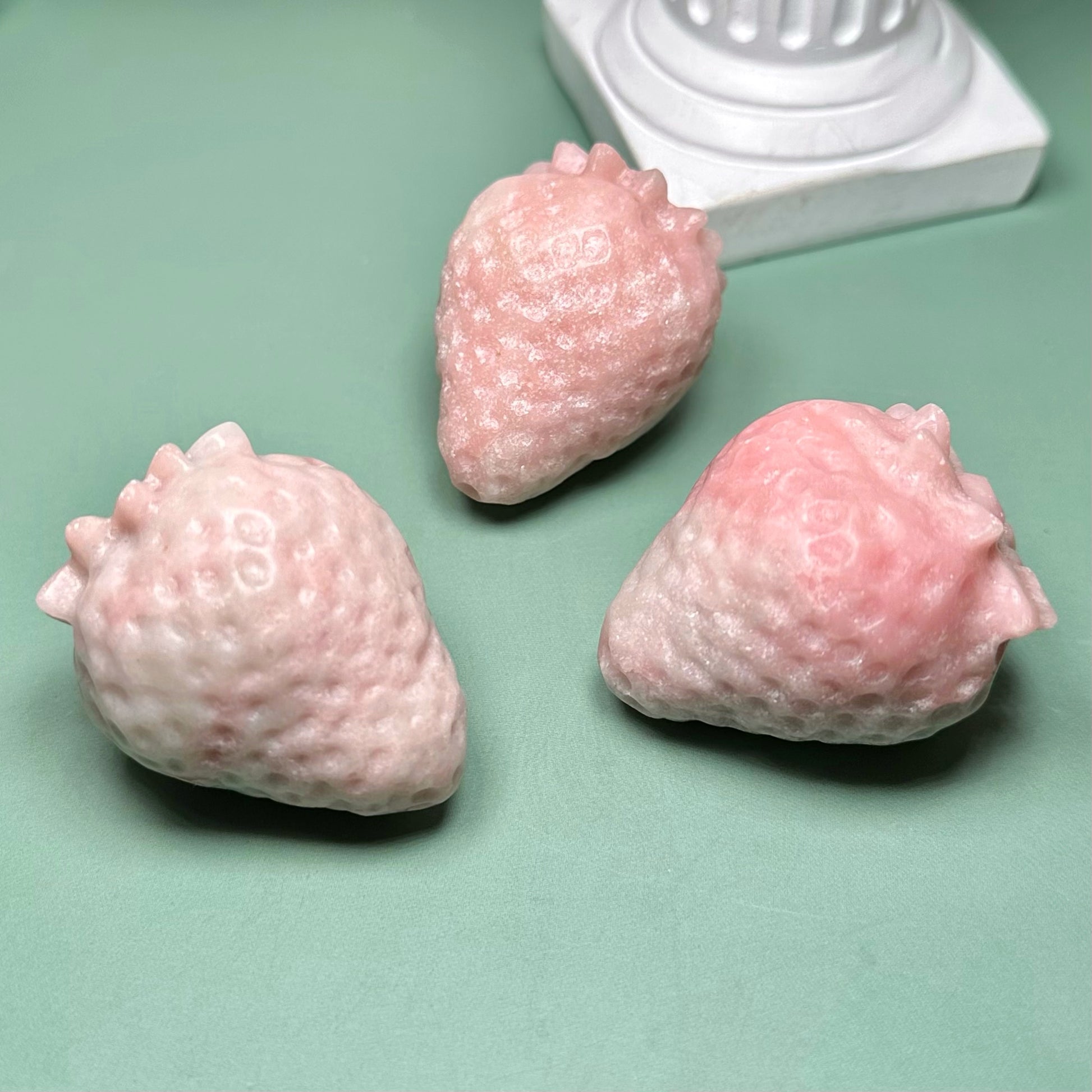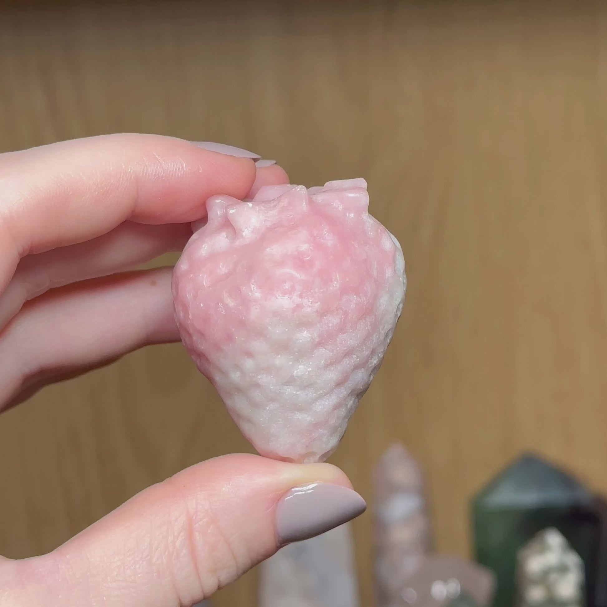 Pink Opal is often seen as a stone of gentle healing, radiating a soft, loving vibration that soothes the heart and calms the emotional body. It’s believed to help release fear, worry, and past trauma, creating space for compassion, self-acceptance, and emotional renewal. This delicate stone encourages a deeper connection to your own inner truth. Many people work with Pink Opal to invite serenity, unconditional love, and a sense of comfort into their lives. The strawberry carving holds a sweet, vibrant and playful energy.